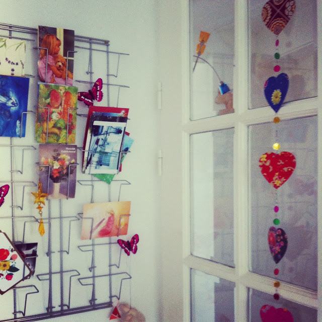 | En het kaartenrek achter de deur met vrolijk gekleurde slinger van harten. |