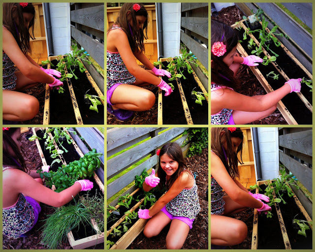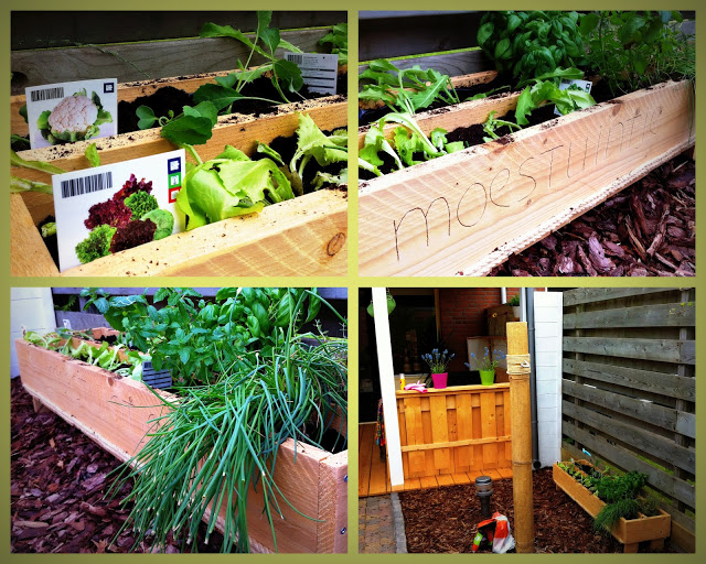 Mama moest haar wel even de grondbeginselen bijbrengen van het moestuinieren want de lieve schat had gedacht dat we nu zaadjes in de grond konden doen en dat we dan over een paar weekjes volgroeide komkommers en aardbeien zouden hebben. Nu begrijpt ze dat we dat volgend voorjaar gaan doen. Vandaag kochten we wel gemengde sla, die we nog tot ver in Oktober kunnen eten, en Winterbloemkool en Andijvie. Verder vulde ze haar tuintje met Munt, Basilicum, Thijm en Bieslook.